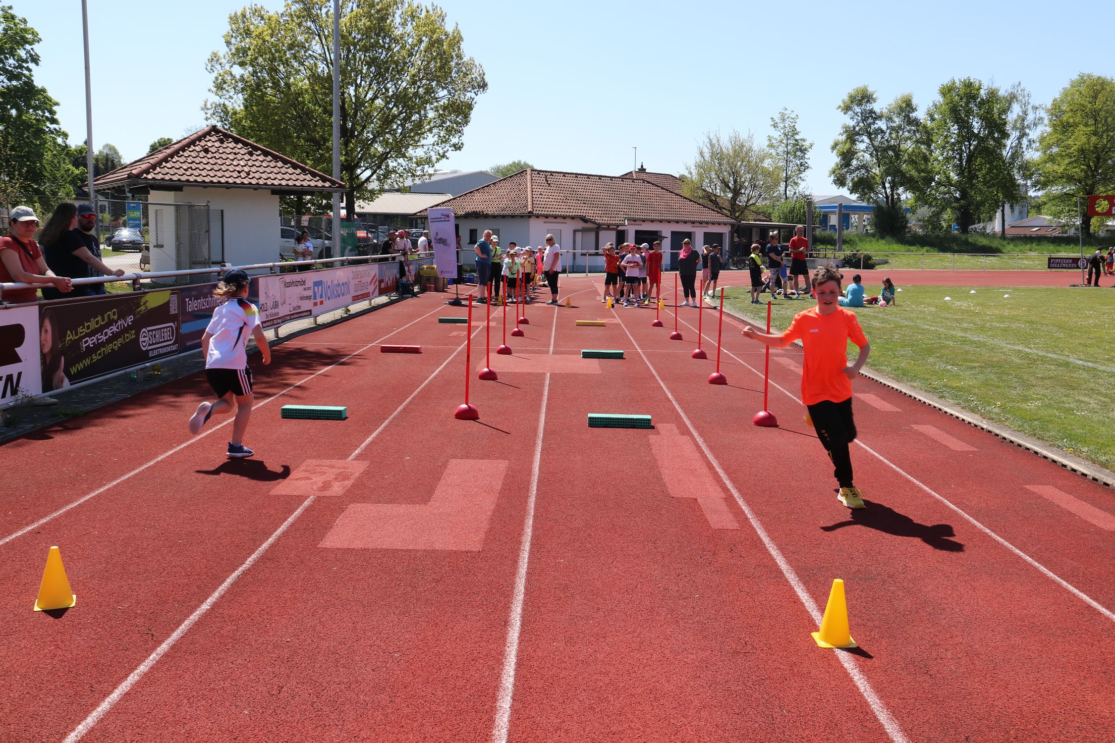 Bei strahlendem Sonnenschein wurde eine nach der anderen Station von den 13 Klassen durchlaufen und nicht nur einmal bekamen die Lehrkräfte, die Helfer:innen und das WLV-Team von den Kindern zu hören, dass die Stationen richtig viel Spaß machen. Ein besonderes Highlight für alle war die Weitsprung-Vorführung des TV Mengen. Athlet:innen von der U12 bis zur U20 sprangen um die Wette und wurden dabei lautstark von den Grundschulkindern angefeuert.