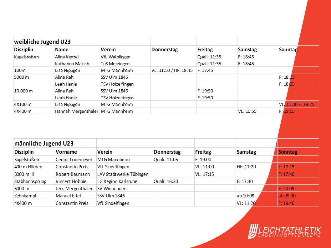 Der Deutsche Leichtathletik-Verband reiste Anfang der Woche mit einem starken Aufgebot, bestehend aus 70 Athletinnen und Athleten, in die schwedische Stadt. Aus Baden-Württemberg wollen zwölf Athleten und Athletinnen ihr Leistungsvermögen demonstrieren und im Kampf um Medaillen und Platzierungen mitmischen.